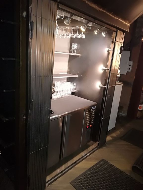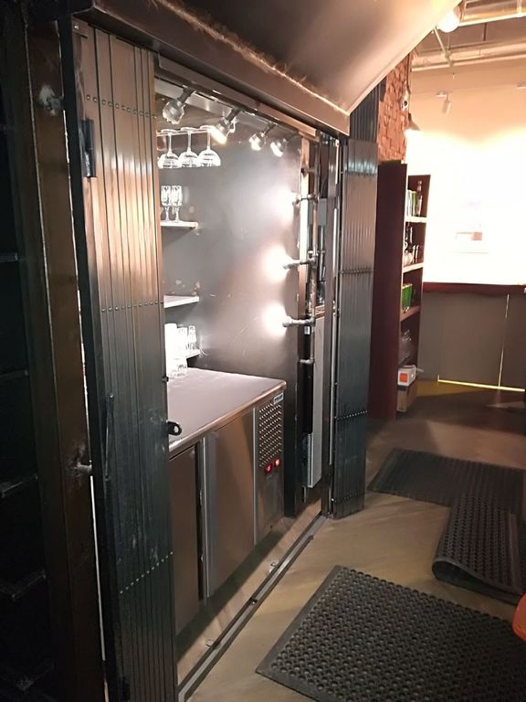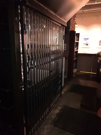 Раздвижная решетка в бар это часть дизайнерского решения в стиле лофт с защитной функцией. Раздвижная решетка установленная в баре раздвигается в две стороны а собранные полотна раздвижной решетки поворачиваются на петлях, что дает полный доступ к барной стойке.